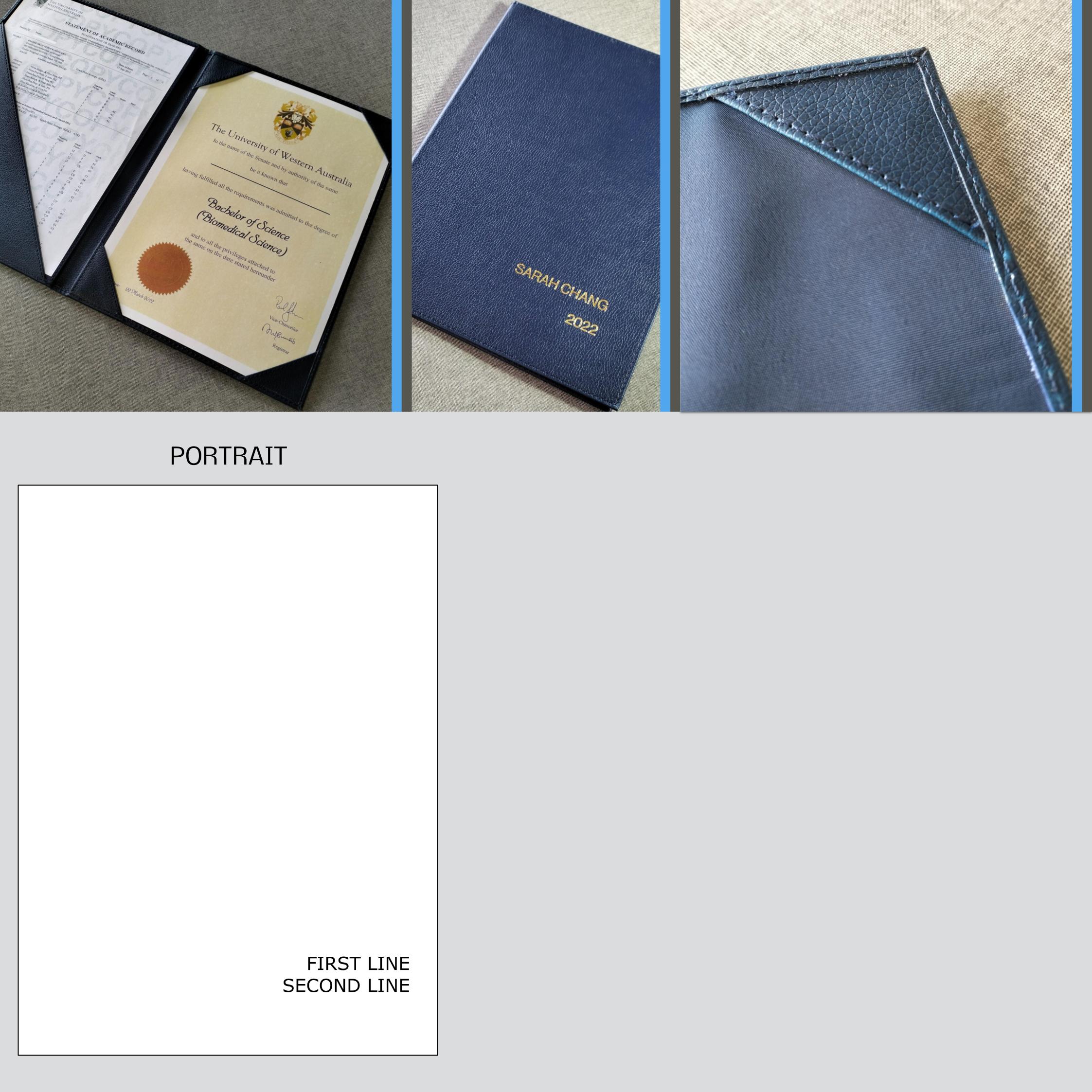 Graduate’s personal details in 2 lines only, are hot stamped onto the front of the folder.